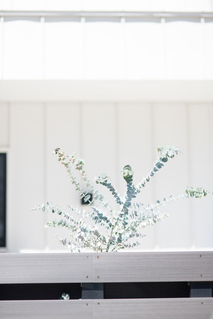玄関先には広々としたデッキが広がり、それに対面するようにベンチが設けられています。ベンチに貼った深い青のタイルは白い外壁とのコントラストを引き立たせます。玄関や勝手口に行くまでのアプローチにはバリアフリーを考慮し、スロープを設けています。
